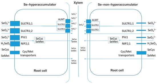 Organic forms of selenium, in particular SeCys and SeMet, are taken up by plant root cells via transporters that catalyze the uptake of Cys and Met, respectively [52]. However, the share of organoselenium compounds and selenites in overall selenium absorption is miniscule in comparison with selenates.