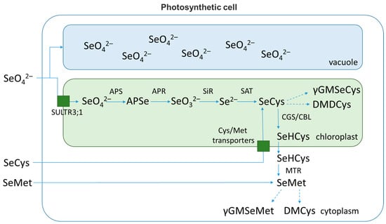 For non-hyperaccumulators, there is strong evidence that selenate reduction occurs by replacing sulfate in the ATP-sulphurylase/APS-reductase system, which is the rate-limiting step in this case [48,63]. This transformation proceeds in two stages. Initially, ATP-sulphurylase catalyzes the interaction of ATP and selenate to form adenosine phosphoselenate. Then, under the action of APS-reductase, selenite is formed [63]. Interestingly, both reactions can occur in the cytosol as well as in the plastids of the cell due to the presence of isoforms of the enzymes indicated above [2,20]. According to other research, this stage occurs mainly in plastids and only a small part of selenium undergoes modification in the cytosol [2,63]. A number of articles mention the possible conversion of selenium into selenolipids or selenoglutathione via adenosine phosphoselenate [65].