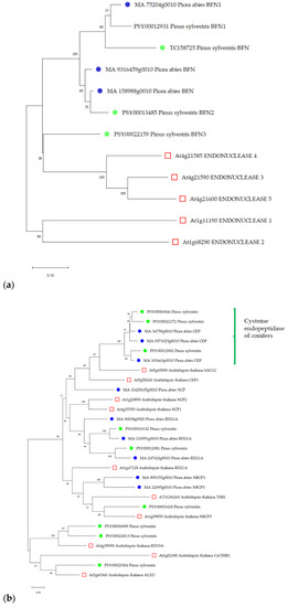 Maximum likelihood phylogenetic tree based on the nucleotide sequences of known genes from Arabidopsis thaliana L. (red squares), Picea abies L. (blue dots), and potential genes of Pinus sylvestris L. (green dots); (a)—bifunctional endonuclease (BFN); (b)—cysteine endopeptidase (CEP); (c)—metacaspase (MC). The tree is drawn on a scale, with lengths of branches in the same units as the evolutionary distances used to infer the phylogenetic tree. The numbers shown next to the branches represent the results of the bootstrap test (1000 replicates). Along with the gene names are the database access codes: PLAZA (P. sylvestris), Congenie (P. abies), Phytozome (A. thaliana), and from Lim et al. [23] (P. sylvestris BFN, TC 158725).