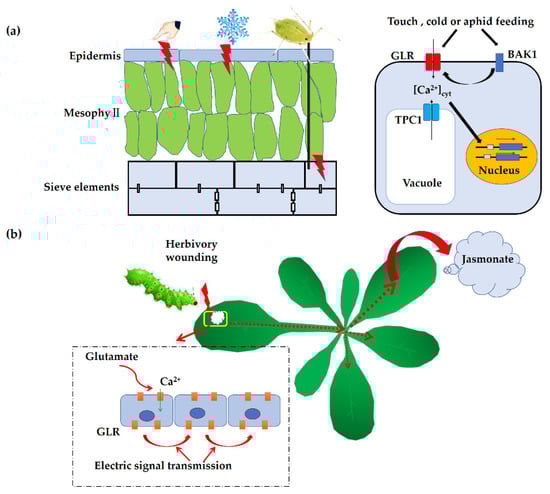 Plant glutamate receptor-like channels (GLRs) are involved in the response to environmental stimuli. (a) Touch, cold, or aphid feeding induces GLR-mediated signal transduction. (b) The role of GLRs in plant defense against herbivory wounding. TCP1, two-pore channel 1. BAK1, BRASSINOSTEROID INSENSITIVE-ASSOCIATED KINASE1.