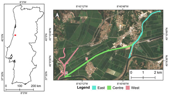 The area analyzed in this study is in central Portugal, within the Mondego River basin, between the cities of Coimbra and Figueira da Foz, a region known as Lower Mondego (Baixo Mondego in Portuguese). It is mostly composed of rice fields and three channels were selected to be monitored. These locations have diversion channels with potential accumulation of water hyacinth (Figure 1). A total area of approximately 46 ha was monitored. The west channel has a size of 10.7 ha (23.2% of the total analyzed area), which has two derivation points, one to the Mondego River main water course and another to the central channel. The central channel, with 25 ha, represents 54.2% of the studied hydric surface which derives to the Mondego River at the end. The east channel has 10.4 ha, represents 22.6% of the analyzed area, and flows to the derivation point of the central channel.