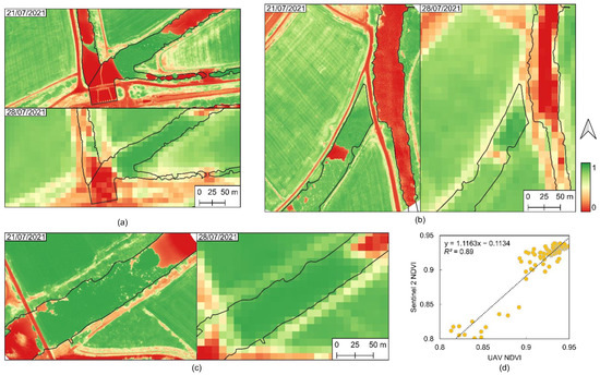 Normalized difference vegetation index (NDVI) of area 1 (a), area 2 (b) and area 3 (c) surveyed by the unmanned aerial vehicle (UAV) on 21 July 2021 and by Sentinel-2 on 28 July 2021, and (d) the linear correlation of water hyacinth NDVI pixels obtained from Sentinel-2 and UAV.
