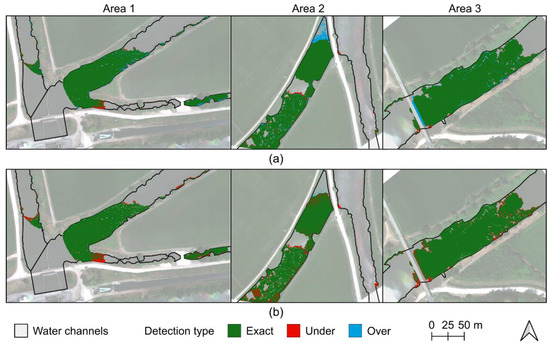 When comparing the classification results of the evaluated methods, the NDVI thresholding approach shows a mean detection of 97.81% (97.51% in area 1, 97.12% in area 2, and 98.79% in area 3) while the RF classifier provided a mean detection rate of 93.31% (93.84% in area 1, 91.02% in area 2, and 95.08% in area 3). Figure 3 presents a visual representation of the correctly, under-, and over-detected pixels when compared with the manually digitized masks in both approaches. Both approaches present misclassifications in a small region of area 1, this being more noticeable in the RF classification. In area 2, another plant species was classified as water hyacinth when relying on the NDVI and a region of water hyacinth that had a considerable flower density was not detected by the RF algorithm. In area 3, some plants were not detected by both approaches, while when using NDVI there was a region located near the bridge that was over-detected.