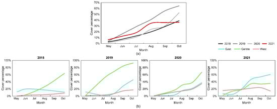 Water hyacinth temporal cover percentage evolution in each year, from May to October, for the whole study area (a) and in each analyzed water channel (b).