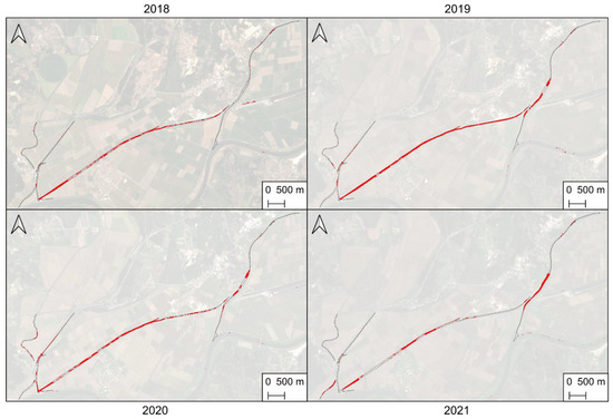 Figure A1 presents the generated water hyacinth distribution maps in the monitored months (when data are available) between 2018 and 2021.