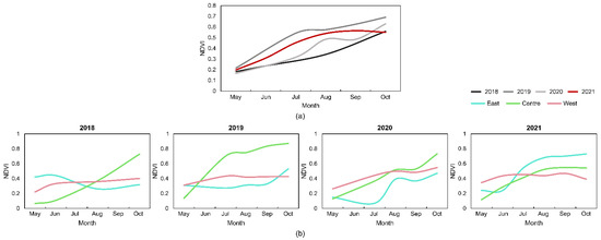 Regarding the mean NDVI of the studied area (Figure 6a), there was a constant growth over time. May had the lowest values in the four years, approximately 0.2, with the lowest value observed in May 2020. On the other hand, October presented the highest mean NDVI values in 2018, 2019, and 2020 (respectively, 0.56, 0.69, and 0.63), while, in 2021, the highest value was reached in September (0.56). In June, the lower values were observed in 2018 and 2020 (0.24), followed by 2021 (0.31) and 2019 (0.38). The same trend was observed in July, August, and September 2018, presenting the lower mean values, followed by 2020 and 2021, and the higher mean values observed in 2019. Regarding the mean NDVI value per channel (Figure 6b), the central channel presented the lowest value in the four years (respectively, 0.07, 0.14, 13, and 0.12). On the other hand, the central channel presented the higher overall annual value in October 2018, 2019, and 2020, with a mean NDVI of 0.73, 0.87, and 0.73, respectively. In 2021, the highest mean NDVI value was recorded in October in the east channel (0.73).