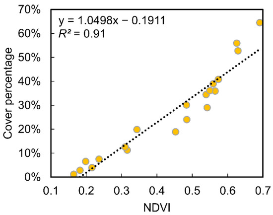 Linear correlation between water hyacinth cover percentage and mean normalized difference vegetation index (NDVI) of the water channels. Values from May to October 2018 to 2021.