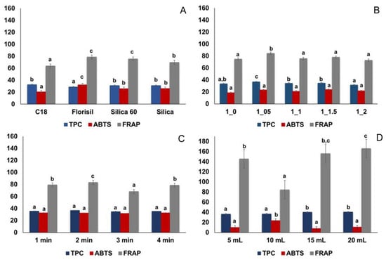 Influence of extraction parameters: (A) selection of stationary phase (adsorbent); (B) ratio of sample to adsorbent (S/A ratio); (C) time of vortexing and (D) ratio of sample to extraction solvent on the: TPC (mg GA/g DW); ABTS (mg TE/g DW) and FRAP (mg Fe2+/g DW) for the H. arenarium extracts obtained by the NADES-VA-MSPD extraction method. Different superscripts for the same variable indicate a statistically significant difference at the 95% confidence level (p < 0.05) according to the S-N-K test.
