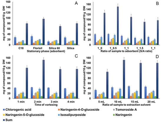 Influence of extraction parameters: (A) stationary phase selection (adsorbent); (B) ratio of sample to adsorbent (S/A ratio); (C) time of vortexing and (D) ratio of sample to extraction solvent on the extraction yield of individual phenolic compounds (mg/10 g DW) from H. arenarium inflorescences by NADES-VA-MSPD.
