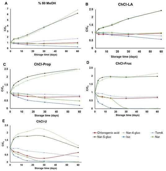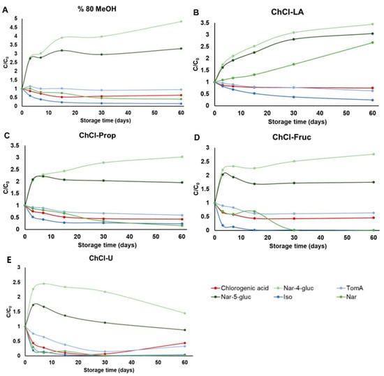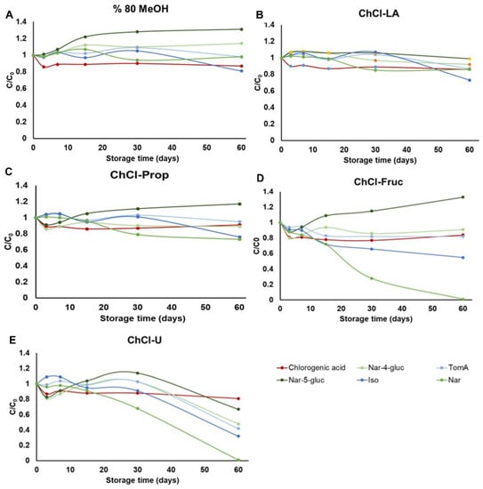 Stability of the selected phenolic compounds extracted from H. arenarium with five different solvents (A) 80% MeOH, (B) choline chloride-lactic acid (1:2) NADES, (C) choline chloride:1,2-propanediol (1:2) NADES, (D) choline chloride:fructose:water (2:1:1) NADES and (E) choline chloride:urea (1:2) NADES), over a period of 0 to 60 days, stored at −18 °C.