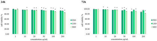 Figure 2. Generally, the results indicate significant antiproliferative effects compared to the nontreated cells, and dose-dependent inhibition of cell viability was observed for both cell lines after treatment with FEO, LEO, and SEO.