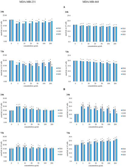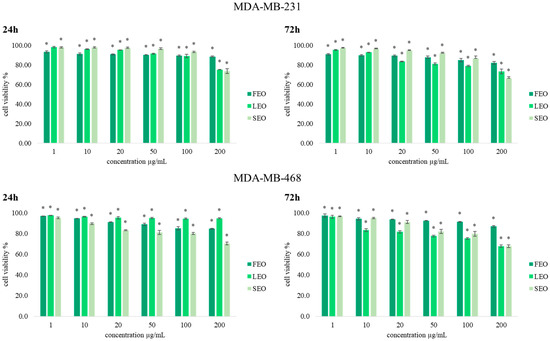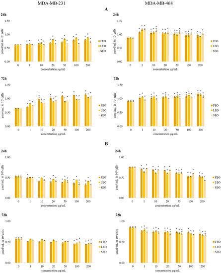 2•−) in MDA-MB-231 and MDA-MB-468 cells after 24 h and 72 h of incubation with various concentrations of FEO, LEO, and SEO are presented. Compared to the control cells, all applied concentrations exhibited a significant reduction in O