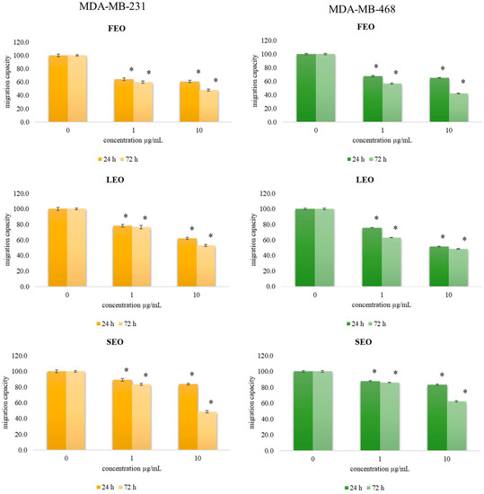 All three examined EOs exerted a drop in cell migration capacity, indicating their favorable usage as chemotherapeutic agents. Both short-term and long-term exposure decreased migration capacity compared to control. The strongest decrease in migration capacity (42.1% compared to the control) was provoked by long-term exposure (72 h) in a concentration of 10 µg/mL of FEO on MDA-MB-468 cells. Since numerous studies indicate that nitric oxide can inhibit cell migration, based on our results regarding ROS production we can suggest that the elevated nitric oxide bioavailability caused by the drop in O2•− leads to the antimigratory outcomes recorded in this study.
