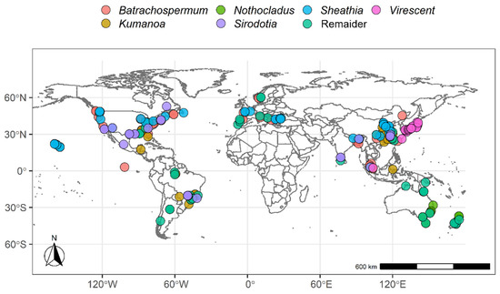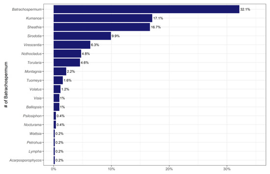 According to the collected specimens, relevant literature [10,12,13,37,38,39,40,41,42,43,44,45,46,47,48,49,50,51,52,53], and information from the Algaebase Database (https://www.algaebase.org/, accessed on 10 September 2022), a total of 16 genera and 101 species of Batrachospermaceae were sorted out in this study (Table 1). Figure 7 shows the proportion of data for each genus of Batrachospermaceae. Some species with the small number of samples are not enough for analytical research. Therefore, 6 genera, Batrachospermum, Kumanoa, Sheathia, Sirodotia, Virescentia, and Nothocladus, with more than 3 species are selected for analysis, and the rest of the genera are classified into one category denoted as Remainder. Table 2 shows the number of samples per genus in the database compiled in this study.