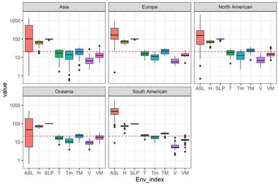 Boxplot of environmental factors of Batrachospermaceae plants in different continents. ASL: Altitude; TM: Maximum temperature; T: Average temperature; Tm: Minimum temperature; H: Average relative humidity; V: Average wind speed; VM: Maximum sustainable wind speed; SLP: Atmospheric pressure at sea level.