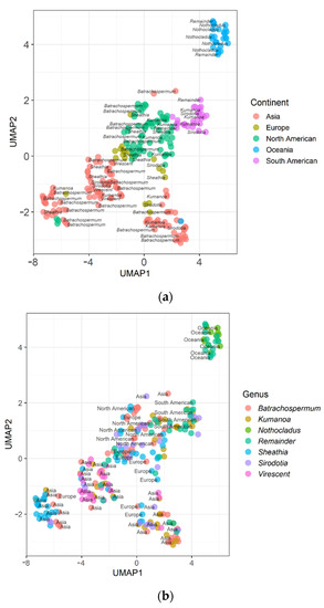 The UMAP clustering results of the data of Batrachospermaceae samples between continents (Figure 3a) show that samples from different continents can be clustered, among which Oceania has the best clustering effect, and European and North American samples close in projected space. The UMAP clustering results among the genera of Batrachospermaceae (Figure 3b) show that the genera Nothocladus and Virescentia have the best clustering effect, followed by the genus Sheathia. The clustering effect of the genera Batrachospermum, Kumanoa, and Sirodotia are slightly inferior.