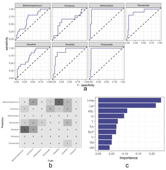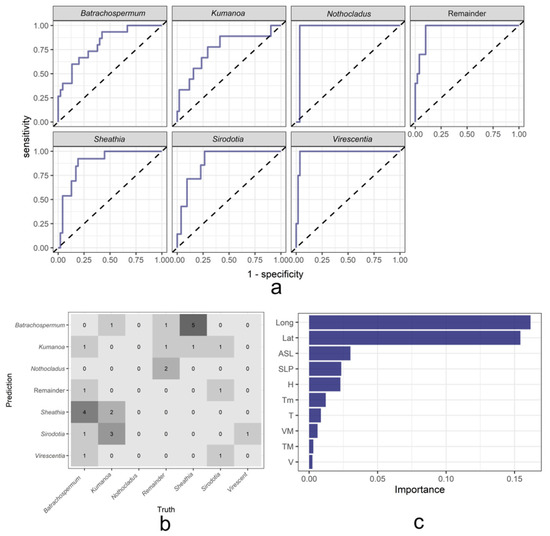 To realize the genus-level classification of Batrachospermaceae based on the geographical distribution and environmental factors, the classical random forest method in machine learning is used first. The overall area under the ROC (receiver operator characteristic) curve (AUC score) of the random forest model for the classification of Batrachospermaceae in this study reached 90.41%, which has a fairly good classification performance. Figure 4a shows the ROC curve of each genus in the random forest model. The full name of the ROC curve is the Receiver Operating Characteristic curve, which shows the tradeoff between specificity and sensitivity and is often used to evaluate the performance of models [25]. ROC curve abscess was 1-specificity, with the false positive rate (FPR) representing the proportion of positive predicted but negative samples to all negative samples. The ordinate of the ROC curve is Sensitivity, true positive rate (TPR), which represents the proportion of predicted positive samples in all positive samples that are positive [26]. Normally, the area range under the ROC curve is 0.5–1. When the area under the ROC curve is closer to 1, the better the performance of the model. The closer the area is to 0.5, the worse the model performance is and the closer it is to random prediction. Among them, the model has the best classification performance for the genera Nothocladus and Virescentia, followed by genera Sheathia and Sirodotia, and the classification effect for the genera Batrachospermum and Kumanoa is slightly lower. Figure 4b is the confusion matrix of the random forest model on the validation set. During the construction of the random forest model, the original data set is randomly divided into a training set and a validation set in a ratio of 3:1. Through the confusion matrix, the real situation can be observed when the model predicts each genus. For easy observation, we set the numbers on the diagonal of the matrix to zero. The predicted values were from the samples of the genus Batrachospermum, and a total of 7 samples were mispredicted, including 1 in the genus Kumanoa, 1 in the Remainder, and 5 in the genus Sheathia. By analogy, it can be found that the samples of the genus Sheathia are easily misidentified as the genus Batrachospermum by the model, and the samples of the genus Batrachospermum are also easily misidentified as the genus Sheathia. These two genera are easily confused by the model, which may be because the two genera in the geographical distribution and environmental factors are similar to each other. In addition, the samples of the genus Kumanoa are easily predicted to be the genus Sirodotia. Figure 4c is the ranking result of the importance of environmental factors on the classification results obtained in the operation of the random forest classification model. It can be found that the altitude in the model is the most important environmental factor affecting the classification results of Batrachospermaceae, followed by atmospheric pressure, average relative humidity, minimum temperature, and average temperature, and to a lesser extent, maximum sustainable wind speed, maximum temperature, and average wind speed.