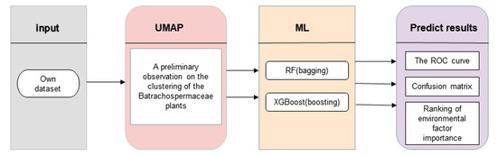 Figure 6 is the method block diagram of this study. The data set in this study is a standardized data set. Uniform manifold approximation and projection (UMAP) was first used to reduce the dimension of the data and preliminarily observe the clustering of each genus. After that, two machine learning methods based on different integration ideas were used to classify the genus of Batrachospermaceae: Random Forest (RF)—bagging integration idea and extreme gradient boosting (XGBoost)—boosting integration idea. Finally, the ROC curve was used to evaluate the classification performance of the model for each genus, and the actual situation of the model classification was observed through the confusion matrix, with the importance of environmental factors affecting the classification results being sorted.