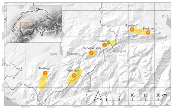 The main focus of the present study is the status of the A. ciliata subsp. bernensis (Figure 1), an endemic taxon occurring exclusively in the Swiss Northern Alps [19,24,25]. It was discovered in 1955 by Swiss botanist Claude Favarger, a professor at the University of Neuchâtel, and described in 1963 [14]. Originally, the taxon was known only from the summit area of Gantrisch and Leiterenpass (Canton of Bern). However, recent studies have shown that it occurs on nearly all summits between Stockhorn in the Canton Bern and Moléson in the Canton of Fribourg (Figure 2), forming an arc of sky-island populations ca. 50 km across [19]. The taxon grows exclusively on shady, cool and steep slopes with northern exposition in the alpine zone above 1900–2000 m a.s.l. (Figure 1). The majority of populations are small (less than 100 individuals), and, globally, the taxon counts no more than ca. 4000 individuals [19].