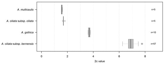 The highest 2c values among all four of the taxa from the A. ciliata complex investigated in this study were recorded for A. ciliata subsp. bernensis, varying between 6.26 pg and 7.75 pg of DNA (Figure 3 and Figure S1, Table 1 and Table S1), with a mean 2c value of 6.91 pg. The recorded genome size of A. gothica reached approximately half of these 2c values and varied between 3.62 and 3.76 pg of DNA, with a mean 2c value of 3.69 pg. Finally, A. ciliata s.str. and A. multicaulis both showed similar, but much lower, values, with a mean 2c value of 1.71 for A. ciliata s.str. and a mean 2c value of 1.57 for A. multicaulis. The higher standard deviation value in the A. ciliata subsp. bernensis is due to a much larger sample size, of 57 individuals, analyzed for this taxon in comparison to the other three taxa (between five and ten individuals).