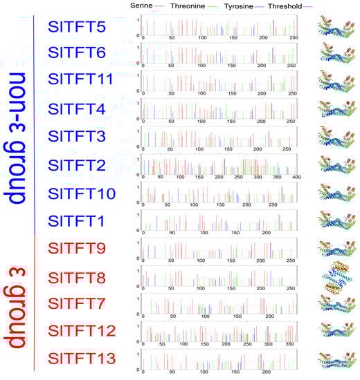 The predicted phosphorylation sites and protein tertiary structure prediction of SlTFTs. The vertical red, green, and blue lines in the middle graph represent the predicted phosphorylation site scores for serine, threonine, and tyrosine, respectively. The horizontal pink line represents the average of the predicted score threshold of 0.5. The gradient colors in the tertiary structure of the protein on the right indicate amino acids from the N-terminal to the C-terminal, different helices, and folded regions with color transitions from blue to red colors.
