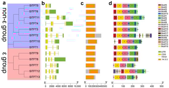 Phylogeny, gene structure, conserved domains, and motif of SlTFTs. (a) Phylogenetic tree of SlTFTs. The blue-purple area represents clustering to the 8 members of the non-ε group, and the orange area represents clustering to the 5 members of the ε group. (b) Structure of exons, introns, and untranslated regions (UTR) in SlTFTs. The green box represents the UTR region in the gene structure, the yellow box represents the CDS region in the gene structure, and the thin gray line represents the intron region in the gene structure. (c) Distribution of conserved domains of SlTFTs. The gray boxes represent protein regions composed of AA, and the orange boxes indicate that they contain 14-3-3 conserved domains. (d) Different motifs contained in SlTFTs. Each of the 20 different gradient colors represents 20 different motifs.