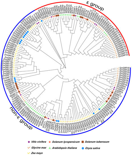 To better understand the evolutionary relationships of the SlTFT family members among different species, we used the ML method to construct a phylogenetic tree of the SlTFT family using 14-3-3 protein sequences from two monocots (rice and maize) and four dicots (A. thaliana, grape, potato, and soybean) species (Figure 3). Based on the phylogenetic relationships, the 170 14-3-3 proteins were divided into two main groups: the ε group and the non-ε group, each consisting of 56 and 114 members. The members in the common group imply that they have comparable origin and evolutionary relationships. The different groups all contain members of 14-3-3s from multiple species, and their origins presumably appeared before the divergence of monocotyledons and dicotyledons. The SlTFTs and StGRFs were mostly clustered next to each other in a branch, indicating that their AA sequence similarity was closer. Some subbranches contain members of only one species, while others contain members of multiple species; presumably, the 14-3-3s are more readily divergent in structure and function, suggesting a diversity of the gene expression and function of the family members.