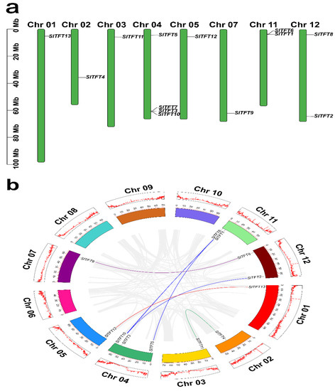 Chromosomal localization and gene duplication events in SlTFTs. (a) Distribution of genes on tomato chromosomes. The green rectangular squares represent chromosomes with specific chromosome numbers and the location and number of SlTFTs distributed on the chromosomes, with a scale of chromosome lengths on the left. (b) Duplicate pairs of SlTFTs in tomato. From outside to inside, the first circle is the chromosome number and density, and the second circle is the ideogram of the chromosome, with the scale on top indicating the coordinate position of the chromosome. Different colored lines indicate synteny pairs of SlTFTs, while gray lines indicate synteny pairs of all tomato genes.