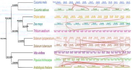 Divergence times and synteny of 14-3-3s among the 10 species. The left side of the figure shows the constructed evolutionary divergence tree with the divergence time labeled above the branches. In the middle are the Latin names of 10 different species. The long bars of different colors on the right side represent the chromosomes of different species. The gray line indicates the synteny of all genes between different species. The red line indicates the synteny of 14-3-3s between different species. The green line indicates the synteny between the 14-3-3s of one species and the non-14-3-3s of another species.