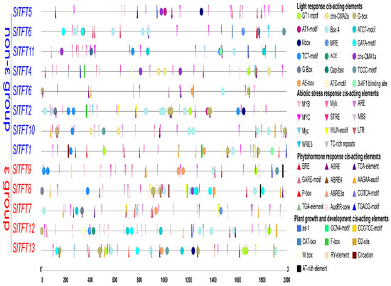 Predicted cis-acting elements in the promoter regions of SlTFTs. Gene names are arranged according to the order of the phylogenetic tree. The different color fonts on the left side are the grouping of SlTFTs and the corresponding members. The thin gray line in the middle represents sequences within 2000 bp upstream of the initiation codon of each SlTFTs, and the scale of base lengths at the bottom, where different colors and shapes of patterns represent different classes of cis-acting elements. A detailed division of the four major categories of cis-acting elements is provided on the right.