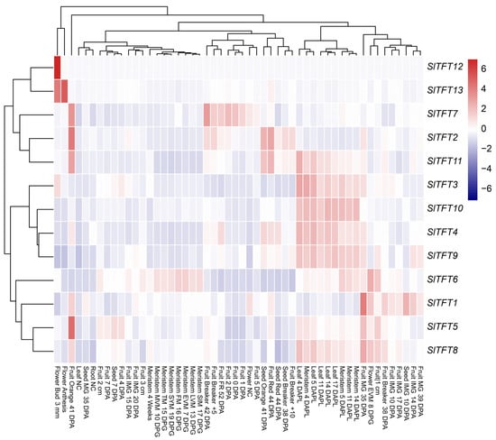 Clustering heat map of the expression patterns of SlTFTs in various tissues. The top of the figure indicates the hierarchical clustering results, and the bottom indicates the seeds, roots, meristematic tissues, leaves, flowers, and fruits at different periods in cultivated tomatoes. The left side of the horizontal coordinate shows the hierarchical clustering results, and the right side shows the expression patterns of all 13 SlTFTs. The gradient from blue to red indicates the expression from low to high.