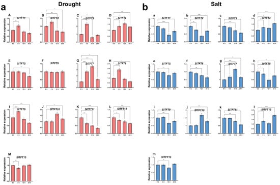 Responses of 13 SlTFTs to different abiotic stress salt (a) or drought (b) treatments. (a) A to M represent SlTFT1 to SlTFT13, respectively. The horizontal coordinates in the figure are the four different treatment periods under 200 mM NaCl treatment, and the vertical coordinates are the relative expression of each SlTFT gene. (b) a to m represent SlTFT1 to SlTFT13, respectively. The horizontal coordinates in the figure are the four different treatment periods under 300 mM D-mannitol treatment, and the vertical coordinates are the relative expression of each SlTFT gene. Error bars are the standard deviations (SD) of three independent biological replicates, presented as mean ± SD. The statistical significance of differences was confirmed by Dunnett’s multiple comparison test (* p < 0.05, ** p < 0.01, *** p < 0.001, and **** p < 0.0001).