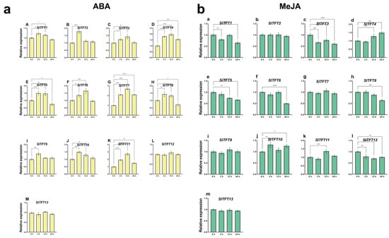 Similarly, under the control treatment of double-distilled water (ddH2O) spraying, no significant difference in expression changes occurred for all the SlTFTs over the full time period (Supplementary Figure S3). However, under the phytohormone ABA treatment, the expression of SlTFT4/7/11 continued to be significantly up-regulated throughout all the periods, with peak expression at 12 h. The expression of SlTFT5/8 was significantly up-regulated at 3 h and 12 h, and significantly down-regulated at 24 h. The expression of SlTFT2/9 was significantly up-regulated at 3 h. The expression of SlTFT1/2/6/10 was significantly up-regulated at 3 h and 12 h. No significant difference in the expression changes of SlTFT12/13 occurred in all the periods (Figure 9a). Under the phytohormone MeJA treatment, the expression of SlTFT3/12 continued to be significantly down-regulated for the entire period. The expression of SlTFT1/5/6/8 was significantly down-regulated in some periods. The expression of SlTFT4 was significantly up-regulated at 12 h and 24 h. The expression of SlTFT11 was significantly up-regulated at 12 h. The expression of SlTFT10 was significantly up-regulated at 3 h and 24 h. The expression of SlTFT2/7/9/13 did not change significantly in all the periods (Figure 9b).