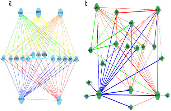 Protein interaction network diagram. (a) Protein interaction network between SlTFTs and other proteins in tomato. (b) Protein interaction network between AtGRFs and other proteins in A. thaliana. Lines of different colors and thicknesses represent the interactions between different proteins. Network construction was performed using String 11.5. In the basic settings, select the full STRING network (the edges indicate both functional and physical protein associations) as the network type. The line color indicates the type of interaction evidence chosen to indicate the meaning of network edges. Active interaction sources include text mining, experiments, databases, co-expression, neighborhood, gene fusion, and co-occurrence. The minimum required interaction score is medium confidence (0.40). The network display mode in the advanced settings is set to interactive SVG (network is a scalable vector graphic [SVG]; interactive). In the network display option, click the “hide disconnected nodes in the network” button.