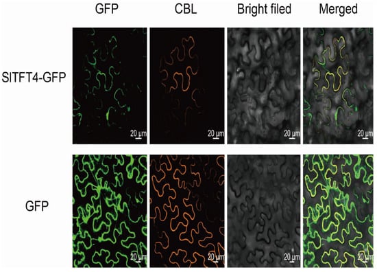 We performed the subcellular localization of SlTFT4 using tobacco leaves as material to further explore the role of SlTFT4. The results of the localization of the SlTFT4-GFP signal, determined by confocal microscopy, showed that the SlTFT4-GFP fusion protein was detected to emit intense fluorescence in both the cytoplasm and the PM, using the membrane localization marker (CBL) as a reference. Thus, SlTFT4 appears to be co-localized in the cytoplasm and the PM (Figure 11). This is largely consistent with the previous results in which SlTFT4 was predicted to be located mainly in the cytoplasm without a transmembrane helix, indicating the reliability of the electronic predictions and again suggesting the possibility of SlTFT4 as a membrane protein.