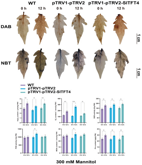 DAB and NBT staining and physiological indices in leaves of different tomato plants under drought stress. WT: untreated wild type plants; pTRV1-pTRV2: control plants injected with an empty vector; pTRV1-pTRV2-SlTFT4: treated plants injected with an SlTFT4 silencing vector. The upper part of the figure shows the DAB and NBT staining of the leaves under different treatment periods of drought stress. The scale bar of the leaves is 1 cm. The physiological indexes of the leaves under different treatment periods of drought stress are measured below. Error bars are the SD of three independent biological replicates, presented as mean ± SD. The statistical significance of differences was confirmed by Dunnett’s multiple comparison test (** p < 0.01, *** p < 0.001, and **** p < 0.0001).