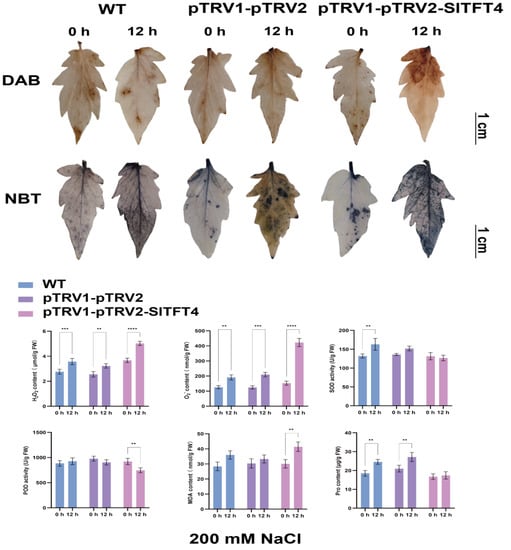 DAB and NBT staining and physiological indices in leaves of different tomato plants under salt stress. WT: untreated wild type plants, pTRV1-pTRV2: control plants injected with an empty vector, pTRV1-pTRV2-SlTFT4: treated plants injected with an SlTFT4 silencing vector. The upper part of the figure shows the DAB and NBT staining of the leaves under different treatment periods of salt stress. The scale bar of the leaves is 1 cm. The physiological indexes of the leaves under different treatment periods of salt stress are measured below. Error bars are the standard SD of three independent biological replicates, presented as mean ± SD. The statistical significance of differences was confirmed by Dunnett’s multiple comparison test (** p < 0.01, *** p < 0.001, and **** p < 0.0001).