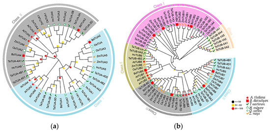 Evolutionary relationships of plant TUA and TUB genes. (a) Evolutionary relationships of TUA genes. (b) Evolutionary relationships of TUB genes. The evolutionary history was inferred using the Neighbor-Joining method. The evolutionary distances were computed using the JTT matrix-based method.