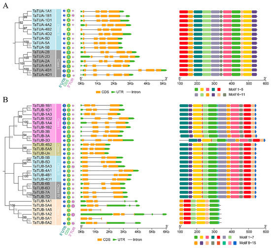 Gene structural diversity and motif type, number, and location are important for the evolutionary and functional analyses of gene family members [19]. The length of most TaTUA genes is in the range of 2406 bp to 3658 bp. The length of the TaTUA-4B1 gene was 5274 bp, significantly different from other TaTUA genes. The variation of TaTUB gene length was large, ranging from 1430 bp to 6067 bp.