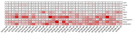 We identified cis-acting elements in the 2000 base pairs upstream of the TaTUA and TaTUB genes using the PlantCARE database, which is shown in Figure 5. The TaTUA-1A1 gene was not identified because of its incomplete promoter sequence. The cis-acting elements were divided into 10 categories after removing core promoters, including ethylene response elements (ERE), auxin response elements (TGA-element and AuxRR-core), GA response elements (GARE-motif, P-box, and TATC-box), SA response elements (TCA-element and SARE), MeJA response elements (TGACG-motif and CGTCA-motif), ABA response elements (ABRE), light response elements (G-Box, Sp1, ACE, GT1-motif), developmental-related elements (CCGTCC motif, CAT-box, RY-element, GCN4_motif), stress response-related elements (STRE, ARE, DRE core, GC-motif, WUN-motif), and MYB\MYC transcription factor binding site. Among them, 355 light response elements, 308 MYB\MYC transcription factor binding sites, and 301 stress-related elements accounted for 63.3% of all cis-acting elements. The result suggested that the transcription of TaTUA and TaTUB genes was regulated by light and the MYB\MYC transcription factor. Meanwhile, they were involved in various biological and abiotic stress response processes. Furthermore, 177 developmental-related elements, 157 ABA, and 147 MeJA response elements were identified, which showed that TaTUA and TaTUB genes were involved in the development of wheat and were regulated by ABA and MeJA. Cis-acting elements were non-uniform in different gene promoters, indicating that the different genes might have different transcriptional regulation patterns.