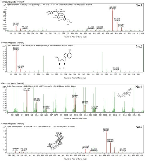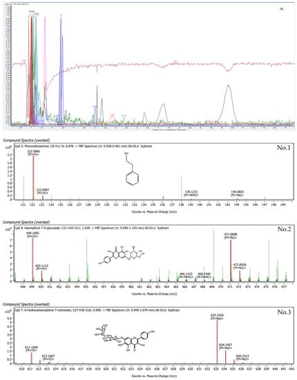 Phytochemical compounds were found in G. inodorum leaves extracted by LC-QTOF/MS. The compounds in G. inodorum revealed by LC–QTOF/MS analysis are listed in Table 5, and the LC-QTOF/MS chromatograms are shown in Figure 3. Among these, all compounds produced a matching score >90% and were identified as 6-hydroxykaempferol 7-rutinoside, ascorbyl stearate, adenosine, gymnemic acid I, phenethylamine, momordin Ia, saikosaponin L, isoorientin 2″-[feruloyl-(->6)-glucoside] and kaempferol 7-O-glucoside. The highest matching score (99.41%) obtained for the G. inodorum leaf extracts was that for 6-hydroxykaempferol 7-rutinoside. 6-Hydroxykaempferol 7-rutinoside is an antioxidant flavonoid that helps to suppress and slow down the free-radical-causing oxidative stress process, which stimulates the body’s inflammatory response. Gymnemic acid I (90.05%) is a class of chemical compounds isolated from the leaves of G. inodorum. They are anti-sweet compounds or sweetness inhibitors.