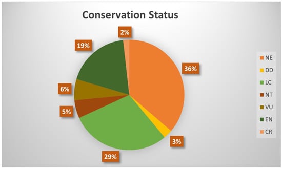 Concerning the status of Cynometra species and based on the Red List of Threatened Species of the International Union for the Conservation of Nature (IUCN) [], 36% of these species are considered as not evaluated (NE), 29% as least concern (LC), 19% as endangered (EN), 6% as vulnerable (VU), and 5% as near threatened (NT). Additionally, 3% and 2% are referred to as data deficient (DD) and critically endangered (CR), respectively (Figure 1).