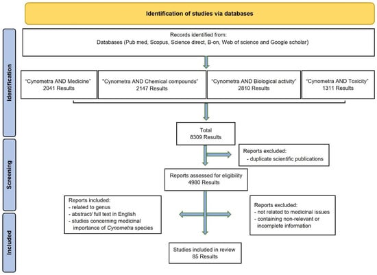 The scientific data were collected from PubMed, Science Direct, Web of Science, B-on, and Google Scholar, selecting all the scientific publications published between 1 January 1980 and 30 June 2022, by using keywords Cynometra AND medicine, Cynometra AND chemical compounds, Cynometra AND biological activity, and Cynometra AND toxicity.