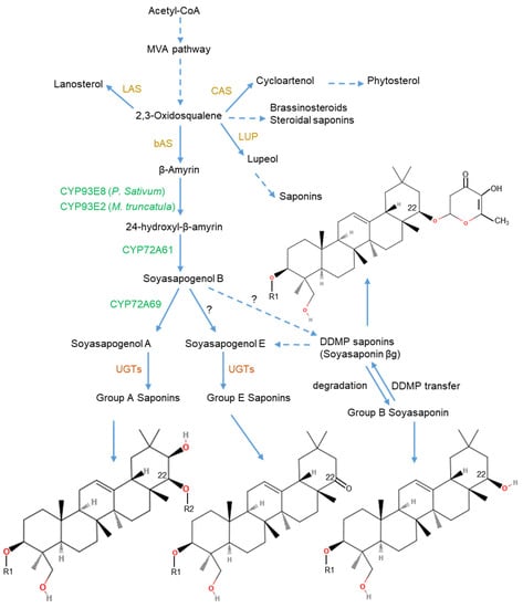 Soyasaponin biosynthesis pathway. MVA, mevalonate; bAS, β-amyrin synthase; CAS, cycloartenol synthase; LAS, lanosterol synthase; LUP, lupeol synthase; UGTs, uridine diphosphate-dependent (UDP) glycosyltransferases. Dashed lines indicate multiple steps involved. Compound structure was drawn using online tool molview, https://molview.org/ (accessed on 6 December 2022). References [9,11,35,39].