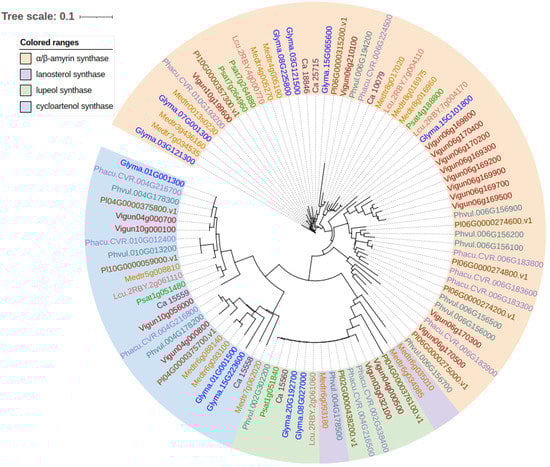 Neighbor-joining phylogenetic tree of oxidosqualene cyclases (OSCs) from pulse crop species. The amino acid sequences of pea (Pisum Sativum) OSCs were retrieved from the reference genome assembly of the cultivar Caméor (https://urgi.versailles.inra.fr/Species/Pisum/Pea-Genome-project, accessed on 6 December 2022). Pea OSCs were used for a blastp search against the proteomes of Medicago (Medicago truncatula, Mtruncatula_Mt4.0v1), common bean (Phaseolus vulgaris L., Pvulgaris_v2.1), chickpea (Cicer arietinum L., Carietinum_v1.0), soybean (Glycine max, Gmax_Wm82.a4.v1), cowpea (Vigna unguiculata L. Walp, Vunguiculata_v1.2), lima bean (Phaseolus lunatus, Plunatus_V1), tepary bean (Phaseolus acutifolis A. Gray, Pacutifolius_v1.0) and lentil (Lens culinaris Medik., Lculinaris_v1) on Phytozome 13 (https://phytozome-next.jgi.doe.gov/, accessed on 6 December 2022). Amino acid sequences were aligned using ClustalW with default parameters, and the neighbor-joining phylogenetic tree was constructed in the program DNASTAR Lasergene 17. Visualization of the tree was performed using online tool iTOL v6 (https://itol.embl.de/, accessed on 6 December 2022) [48].