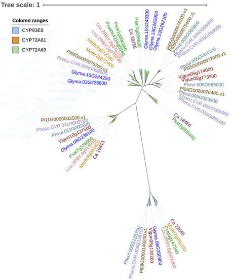 Neighbor-joining phylogenetic tree of cytochrome P450 monooxygenases (P450s) from pulse crop species. The amino acid sequences of pea CYP93E8, Medicago CYP72A61 and soybean CYP72A69 were retrieved from GenBank (accession AIN25420.1, ABC59088.1 and BAW35014.1, respectively) and were used for a blastp search against the proteomes of Medicago (Medicago truncatula, Mtruncatula_Mt4.0v1), common bean (Phaseolus vulgaris L., Pvulgaris_v2.1), chickpea (Cicer arietinum L., Carietinum_v1.0), soybean (Glycine max, Gmax_Wm82.a4.v1), cowpea (Vigna unguiculata L. Walp, Vunguiculata_v1.2), lima bean (Phaseolus lunatus, Plunatus_V1), tepary bean (Phaseolus acutifolis A. Gray, Pacutifolius_v1.0) and lentil (Lens culinaris Medik., Lculinaris_v1) on Phytozome 13 (https://phytozome-next.jgi.doe.gov/, accessed on 6 December 2022) and pea (Pisum sativum) cultivar Caméor (https://urgi.versailles.inra.fr/Species/Pisum/Pea-Genome-project, accessed on 6 December 2022). Amino acid sequences were aligned using ClustalW with default parameters, and the neighbor-joining phylogenetic tree was constructed in the program DNASTAR Lasergene 17. Visualization of the tree was performed using the online tool iTOL v6 (https://itol.embl.de/, accessed on 6 December 2022) [48].
