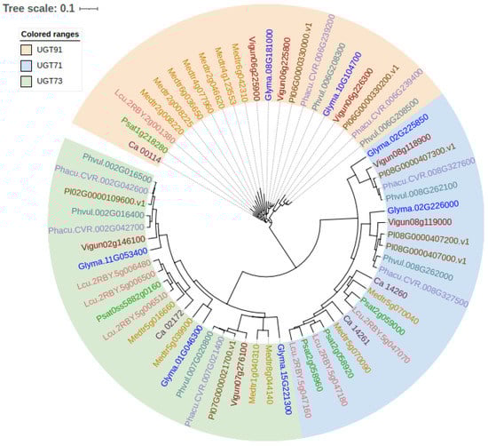 Neighbor-joining phylogenetic tree of uridine diphosphate-dependent (UDP) glycosyltransferases (UGTs) orthologues from pulse crop species. The amino acid sequences of Medicago UGT71G1, soybean UGT73P2 and soybean UGT91H4 were retrieved from GenBank (accession AAW56092, BAI99584 and BAI99585, respectively) and were used for a blastp search against the proteomes of Medicago (Medicago truncatula, Mtruncatula_Mt4.0v1), common bean (Phaseolus vulgaris L., Pvulgaris_v2.1), chickpea (Cicer arietinum L., Carietinum_v1.0), soybean (Glycine max, Gmax_Wm82.a4.v1), cowpea (Vigna unguiculata L. Walp, Vunguiculata_v1.2), lima bean (Phaseolus lunatus, Plunatus_V1), tepary bean (Phaseolus acutifolis A. Gray, Pacutifolius_v1.0) and lentil (Lens culinaris Medik., Lculinaris_v1) on Phytozome 13 (https://phytozome-next.jgi.doe.gov/, accessed on 6 December 2022) and pea (Pisum sativum) cultivar Caméor (https://urgi.versailles.inra.fr/Species/Pisum/Pea-Genome-project, accessed on 6 December 2022). Amino acid sequences were aligned using ClustalW with default parameters, and the neighbor-joining phylogenetic tree was constructed in the program DNASTAR Lasergene 17. Visualization of the tree was performed using the online tool iTOL v6 (https://itol.embl.de/, accessed on 6 December 2022) [48].