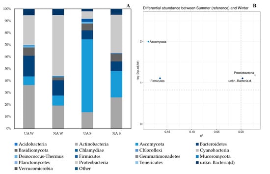 Figure 2. (A) Relative average abundance of phyllospheric bacterial and fungal taxa at Phylum level. (B) Differential Abundance Analysis (DAA) plot (based on ZicoSeq (GUniFrac package). The plot shows the y-axis as the log10 (adjusted) p-value and the x-axis as the signed R2, which indicate the association direction with the covariate (− and + with urban and natural areas, respectively). The names of differential taxa passing a specific significance cutoff (permutation-based FDR-adjusted p-Values = 0.1) are printed on the figure. (A) Only taxa with an average abundance ≥ 0.01% in at least one of the four groups (Urban Area W, Natural Area W, Urban Area S, Natural Area S) of samples are shown. Samples are grouped according to sampling season (W = winter or S = summer) and environmental features (Urban Area or Natural Area).