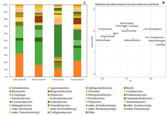 Figure 3. (A) Relative average abundance of phyllospheric bacterial and fungal taxa at Class level. (B) Differential Abundance Analysis (DAA) plot (based on ZicoSeq (GUniFrac package). The plot shows the y-axis as the log10 (adjusted) p-value and the x-axis as the signed R2, which indicate the association direction with the covariate (− and + with urban and natural areas, respectively). The names of differential taxa passing a specific significance cutoff (permutation-based FDR-adjusted p-Values = 0.1) are printed on the figure. (A) Only taxa with an average abundance ≥ 0.10% in at least one of the four groups (Urban Area W, Natural Area W, Urban Area S, Natural Area S) of samples are shown. Samples are grouped according to sampling season (W = winter or S = summer) and environmental features (Urban Area or Natural Area).