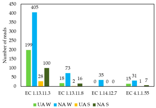 Figure 6. Barplot showing the average value, for each sample type (Urban Areas Winter-UA W; Natural Areas Winter-NA W; Urban Areas Summer-UA S; Natural Areas Summer-NA S), of reads number for genes involved in the synthesis of the enzymes protocatechuate 3,4-dioxygenase (EC 1.13.11.3), protocatechuate 4,5-dioxygenase (EC 1.13.11.8), phthalate 4,5-dioxygenase (EC 1.14.12.7), 4,5-dihydroxyphthalate decarboxylase (EC 4.1.1.55) revealed by the functional metagenomic analysis carried out on the microorganisms extracted from the leaf samples.